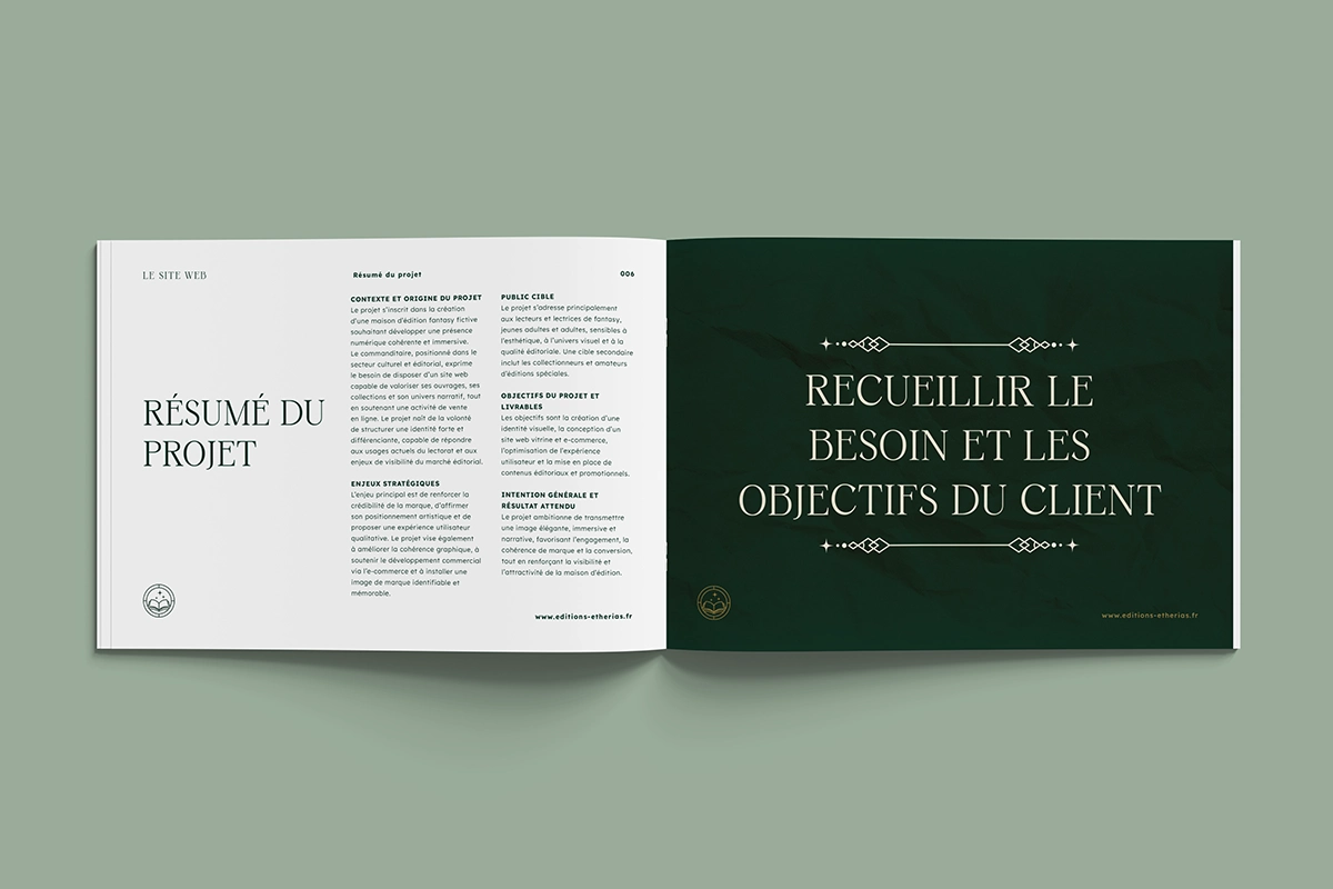 Le projet Éditions Etherias s’appuie sur un dossier de conception complet qui structure l’ensemble de la démarche de création du site et de son univers graphique.